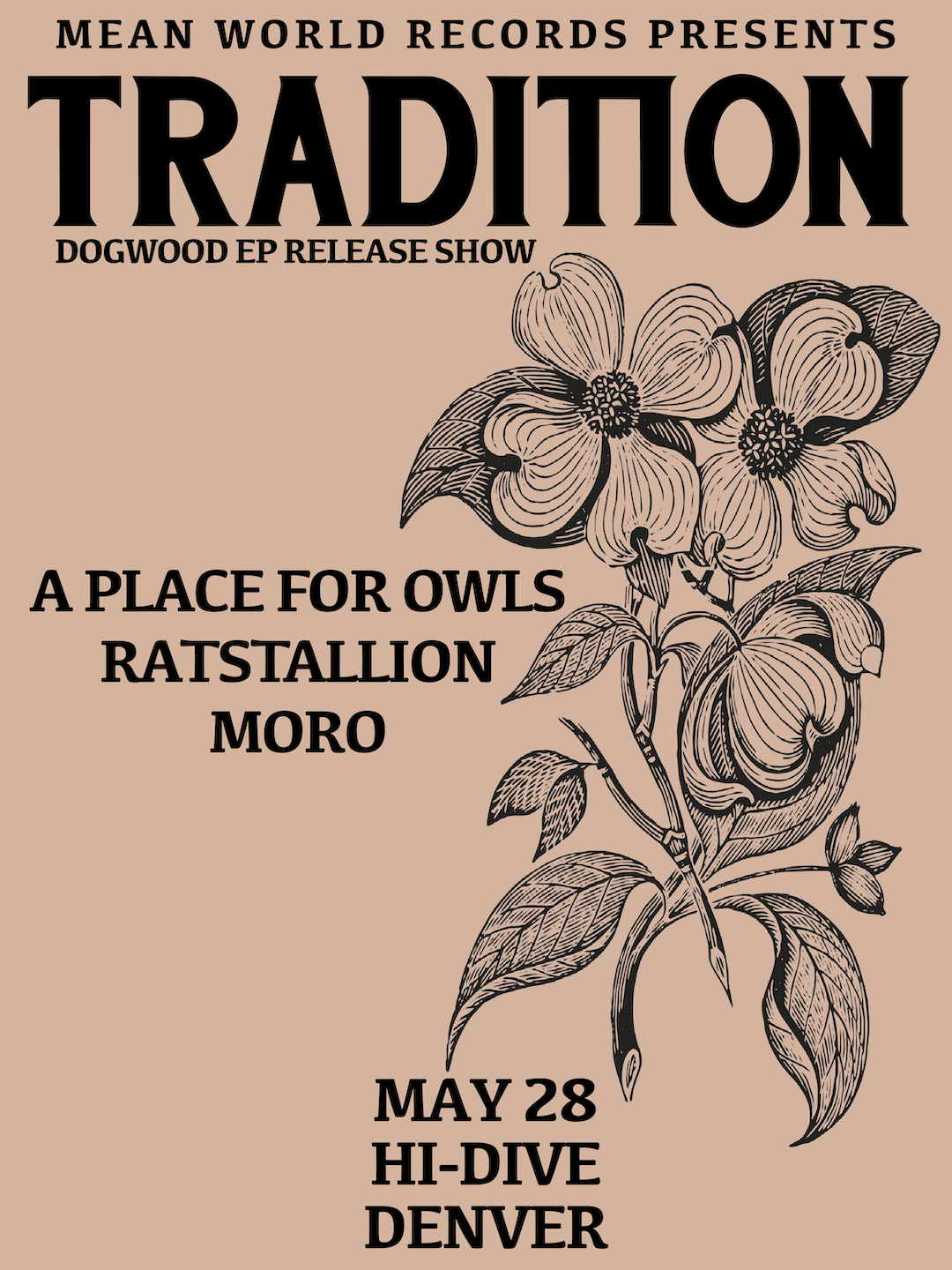 UPCOMING TWEN / MONSOON / TINY TOMBOY MAY 1SOUND BAR TICKETS TRADITION / A PLACE FOR OWLS / RATSTALLION / MORO MAY 28HI-DIVE TICKETS THE BRIGHT LIGHT SOCIAL HOUR / TARANTULA BILL JUNE 26LEVITT PAVILION TICKETS